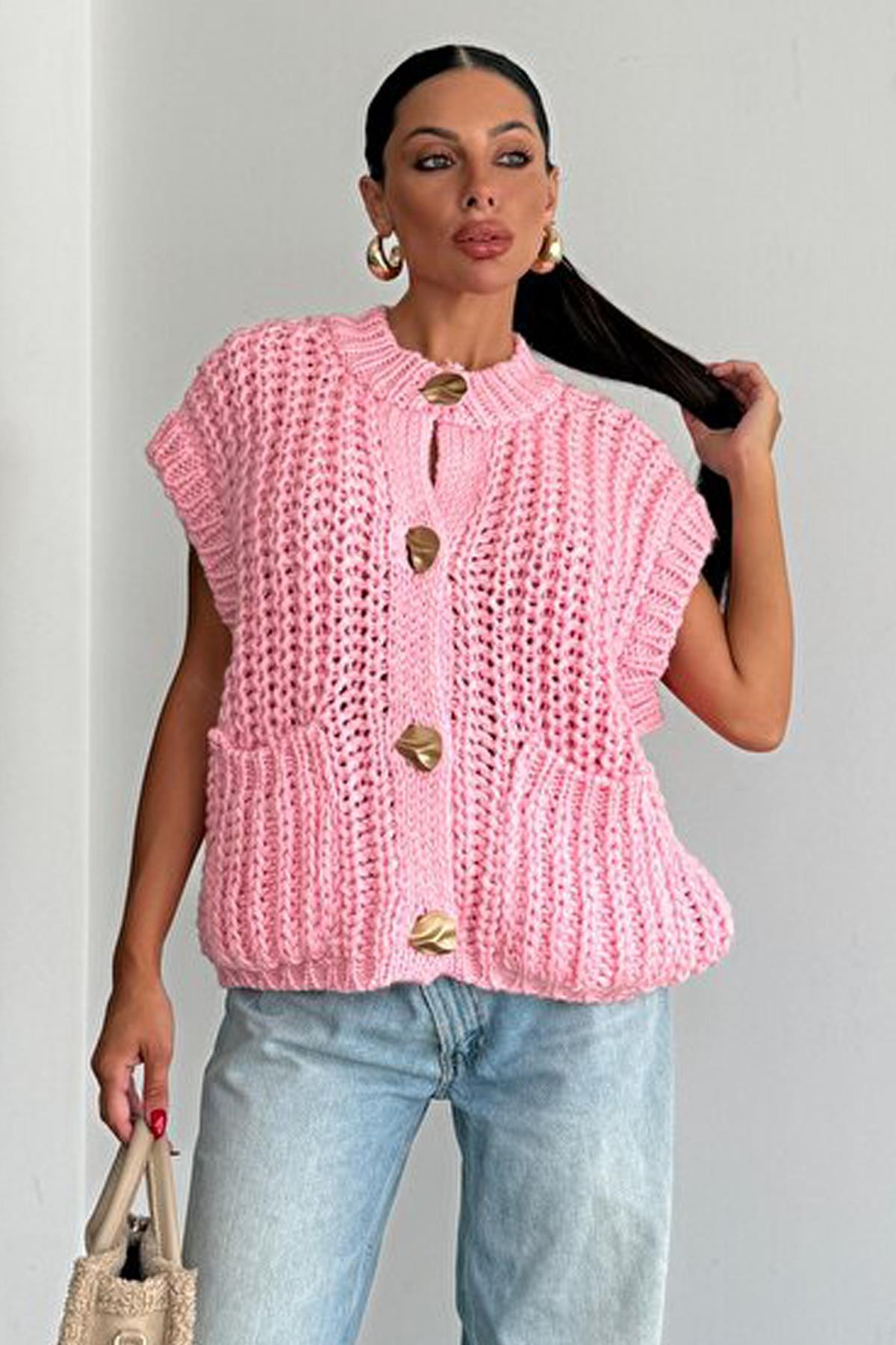 Kalın Örgü Gold Düğmeli Premium Trend Yelek - Pembe