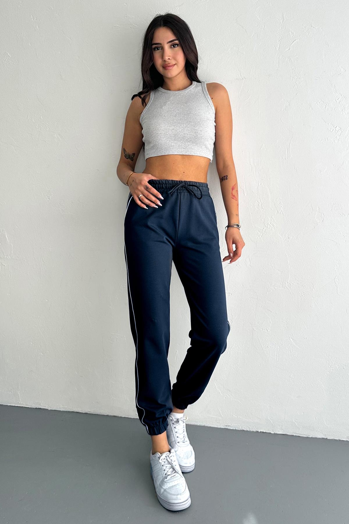 Şerit Detaylı Paça Lastikli Kompakt Penye Eşofman - Lacivert